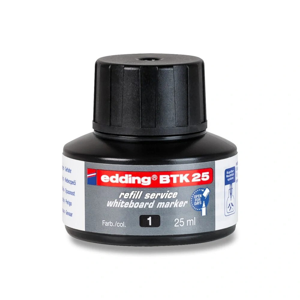 EDDING BTK25 Inkoust určený pro opětné naplnění tabulových popisovačů edding comfort 2, 250, 360, 361, 363, 365, 28. Popisovač nasaďte do lahvičky hrotem dolů a po několika minutách je popisovač opět připraven k použití. Obsah 25ml