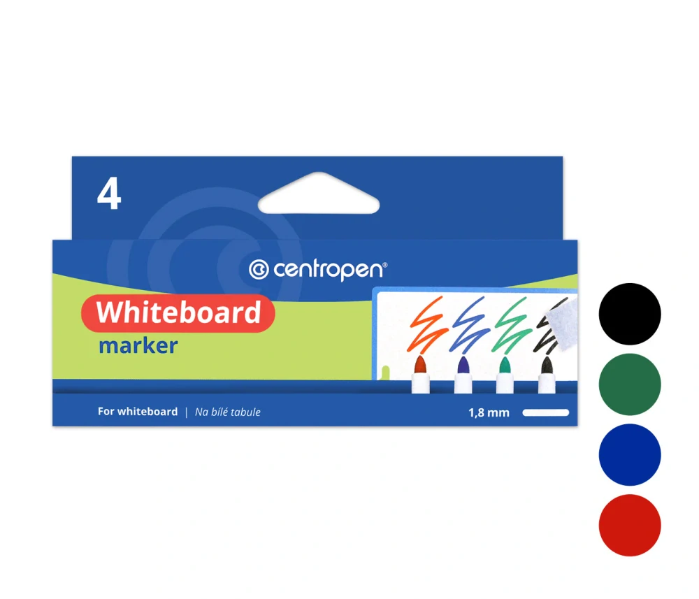 Sada značkovačů na bílé stíratelné tabule s ergo úchopovým držením. Vhodné na film, fólie, kov, plast, pryž, sklo, porcelán. Za sucha stíratelný, permanentní, světlostálý inkoust na alkoholové bázi, zdravotně nezávadný, bez zápachu. Skladovat ve vodorovné poloze, případně hrotem dolů, ventilační chránítko, po použití uzavřít.