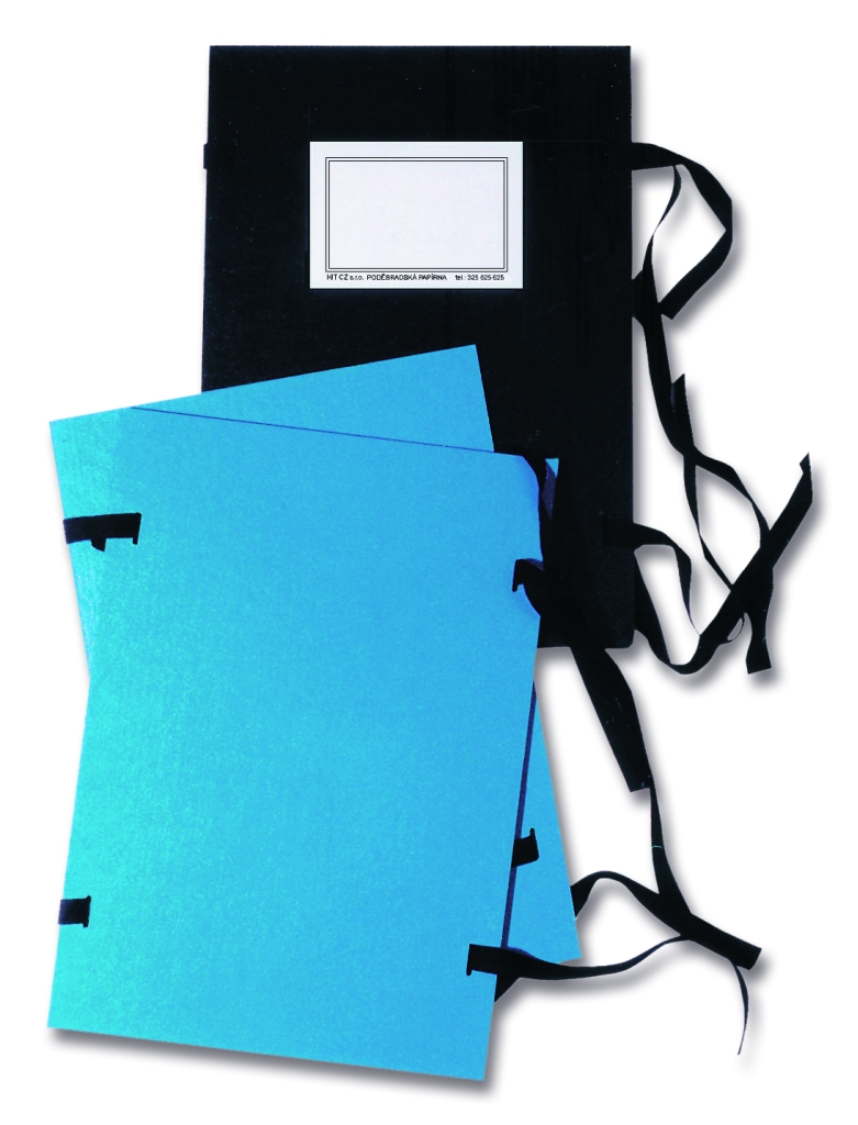 Spisová deska s tkanicí z jednostranně lakované lepenky 1,5 mm v modré nebo černé barvě.
