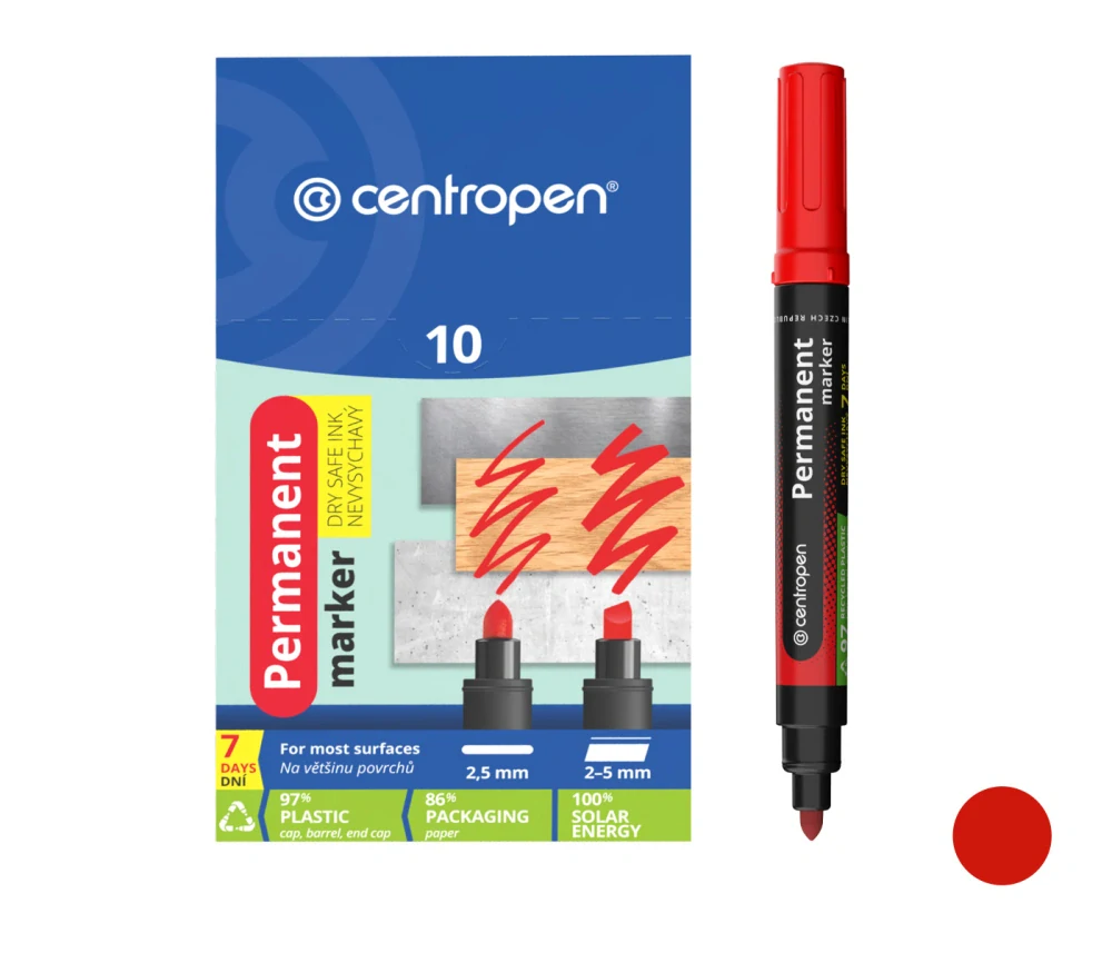 Permanentní značkovač, který díky své speciální inkoustové náplni vydrží i 14 dní otevřený a nevyschne. Píše na papír, karton, plast, sklo, keramiku, dřevo, kov i kámen. Permanentní inkoust na alkoholové bázi. Stopa písma 2,5mm je odolná vodě, teplotě do 100 st.C, otěru a povětrnostním vlivům.